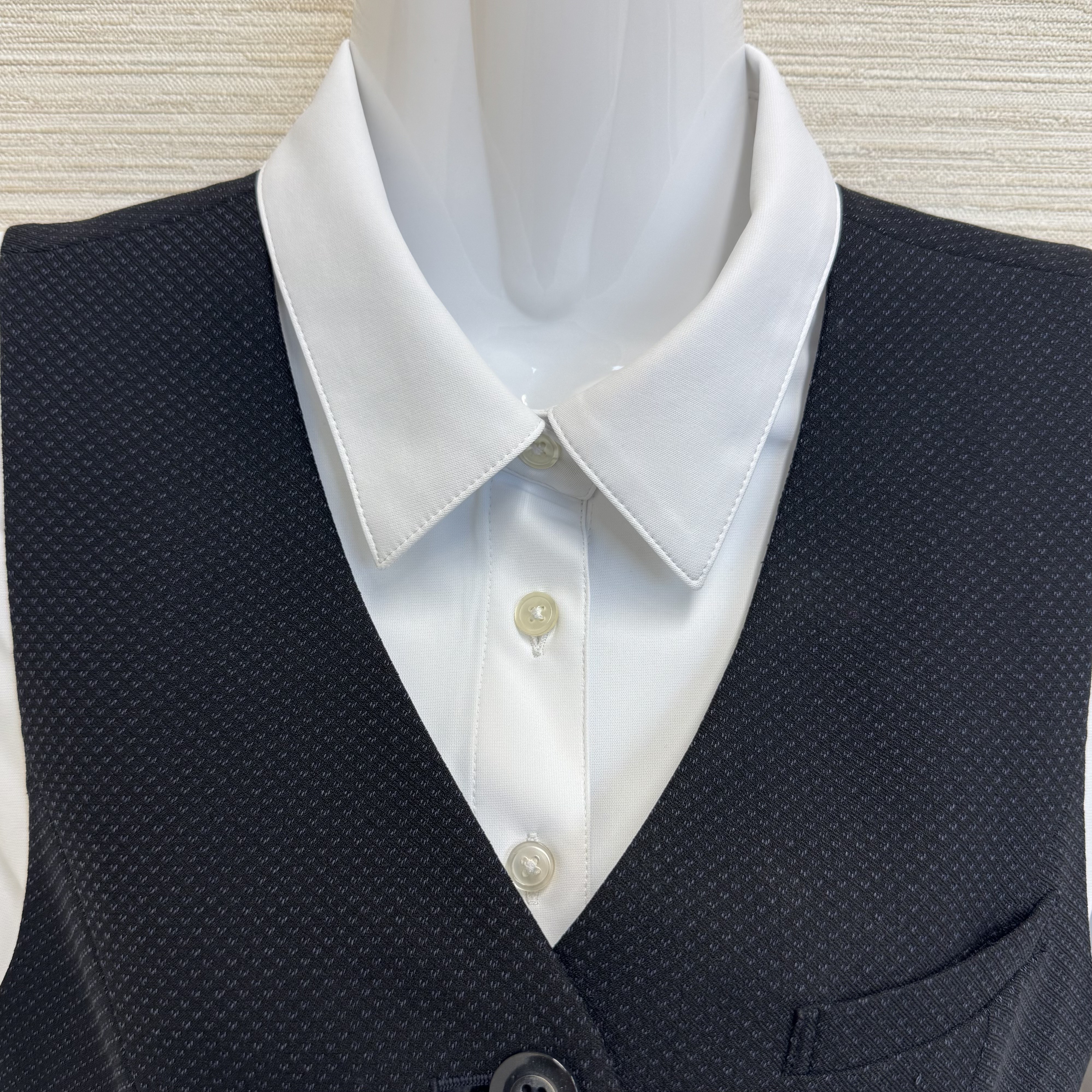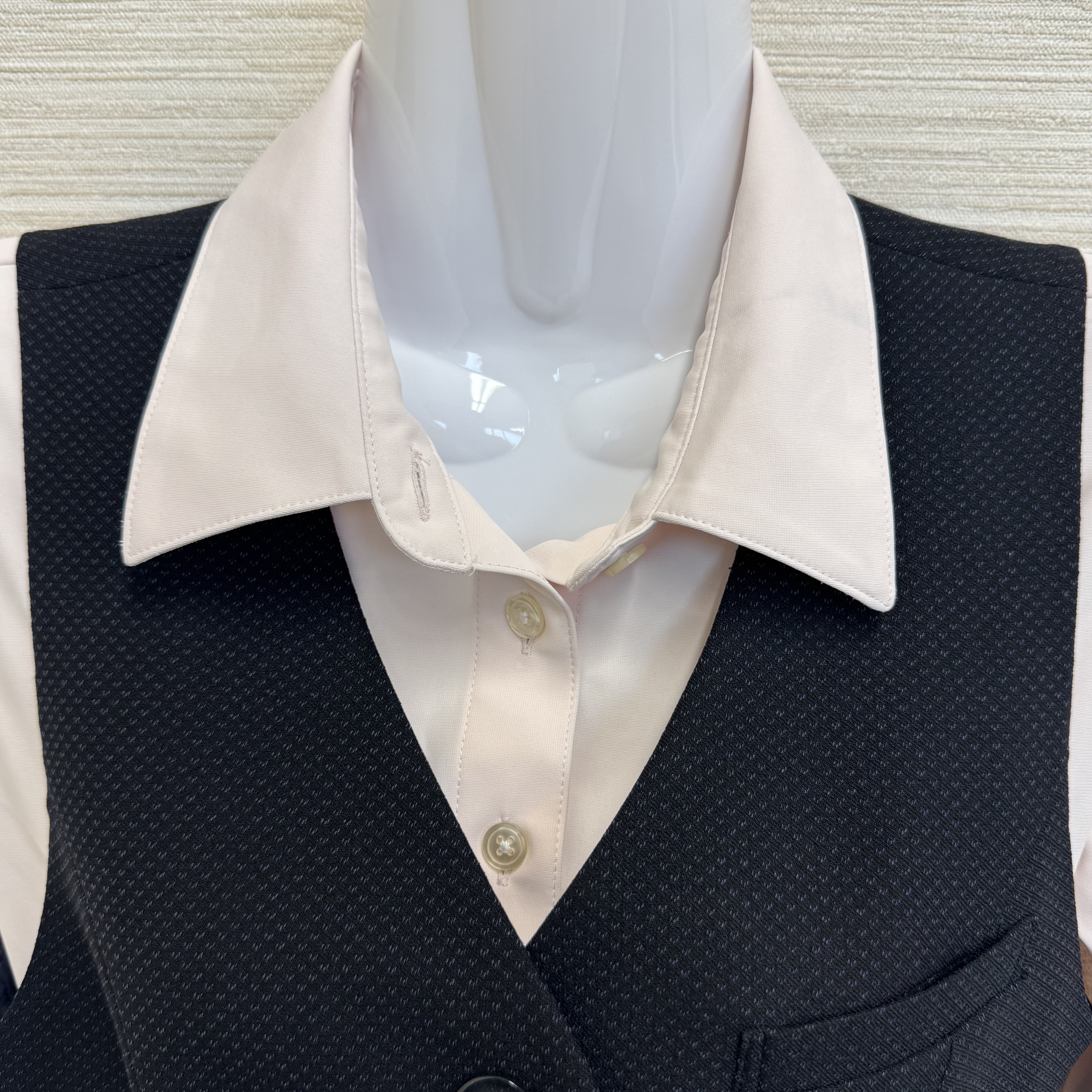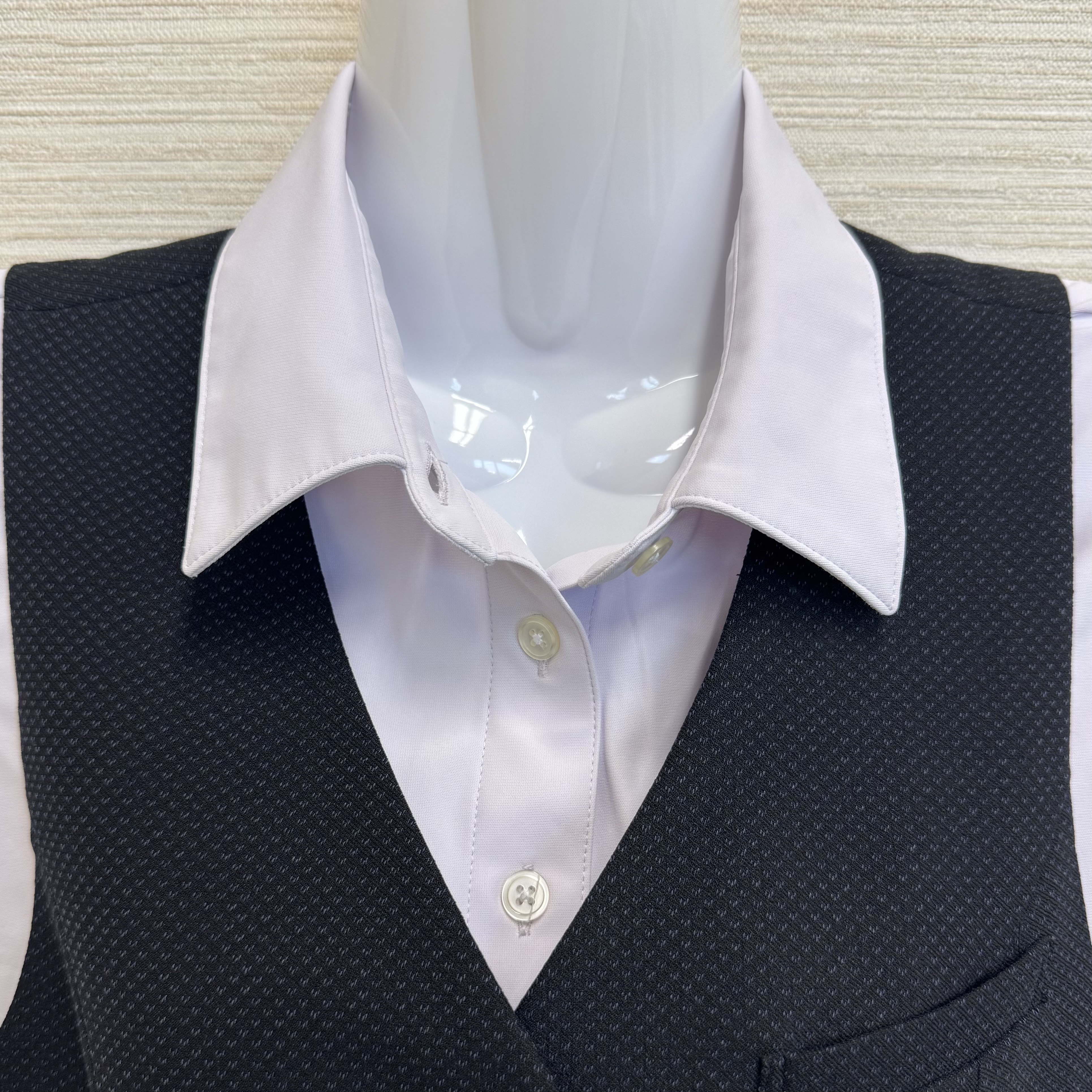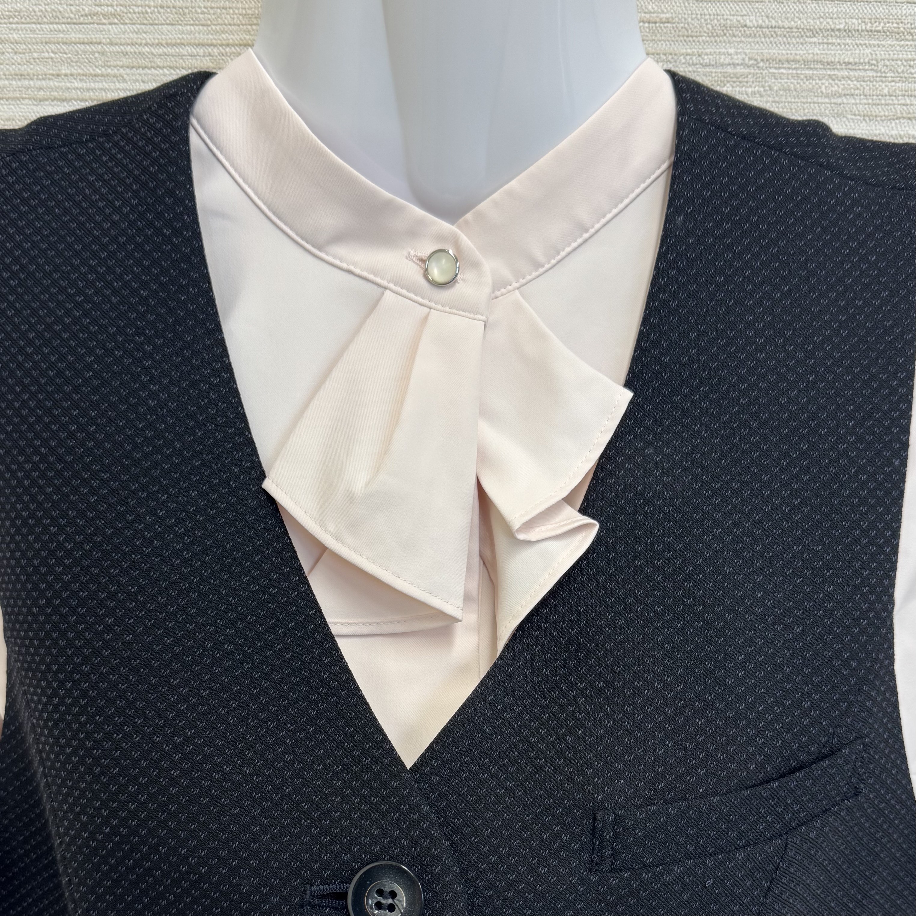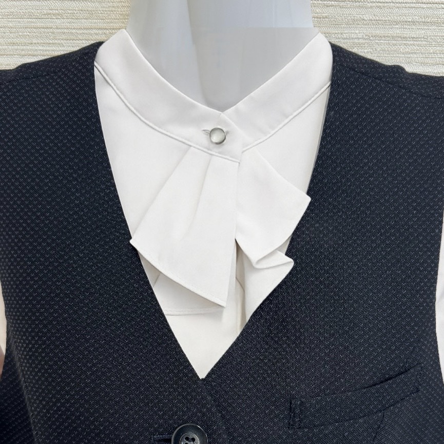 また、2025年4月より、通常タイプのブラウスに加えて、ノーカラー(襟なし)のブラウスも導入しました! 首元に可愛いフリルがついており、皆のお気に入りです。
